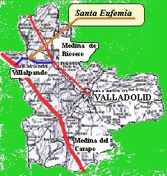 Tierra de Campos, al noroeste de la provincia, a 60 Kms de la capital. El termino municipal de Santa Eufemia tiene una extensión 24,8 Km2. El núcleo urbano se localiza en el kilómetro 19 de la comarcal C-611, entre las localidades de Medina de Rioseco y Villalpando Limita al norte con Barcial de la Loma y Villar de Fallaves, al este con Villafrechós, al sur con Cabreros del Monte y al oeste con Villamayor de Campos y Quintanilla del Monte. |
